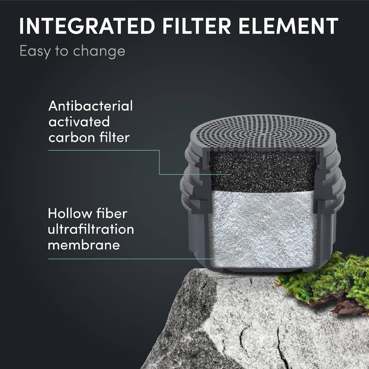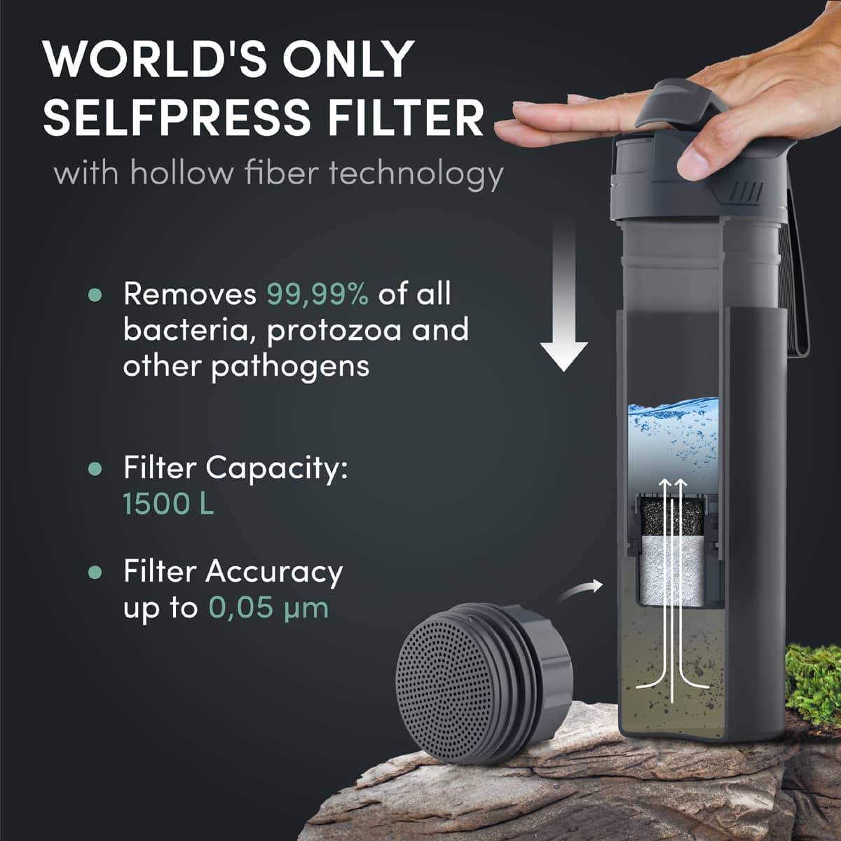 Unik filterkonstruktion fra BACHGOLD. Hul fiber teknologi og aktivt kul. Brug naturens egne ressourcer og reducer brugen af genbrugsplast. Verdens første og p.t. eneste selvtryk filter med hul fiberteknologi. Ultra fin filternøjagtighed på 0,05µm.