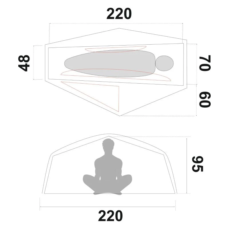 Teltet bygger på den forbedrede DCS-konstruktion (Double Comfort System), som giver markant mere brugbar plads indvendigt – både i siddende og liggende stilling. Inderteltet måler 215 cm i længden og har en bredde på 70 cm ved skuldrene og 48 cm ved fødderne. Loftshøjden på 95 cm sikrer, at du kan sidde oprejst komfortabelt.