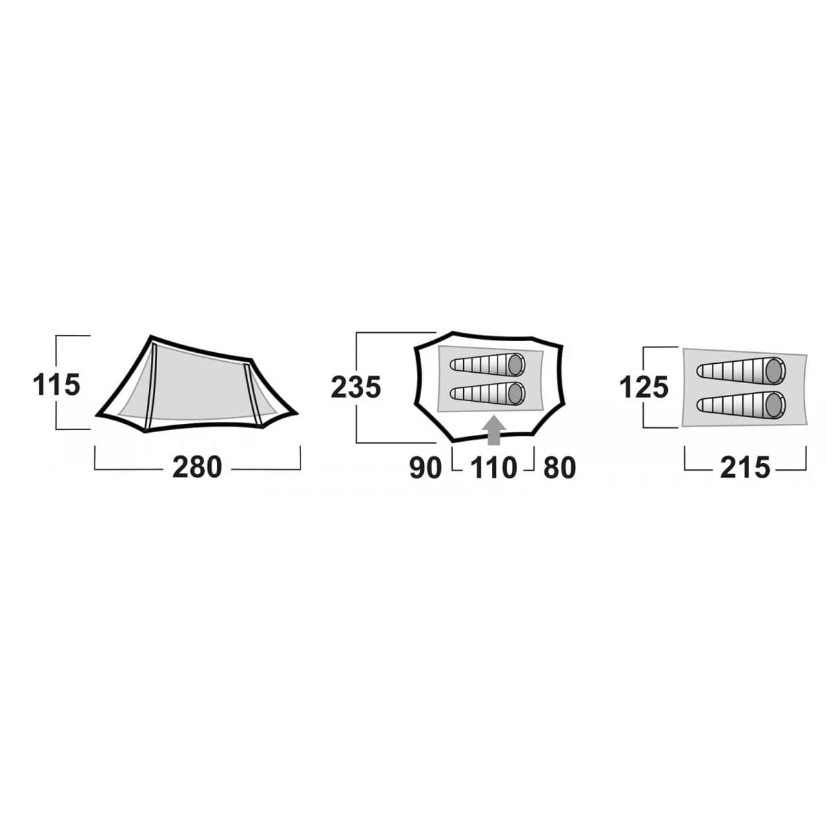 Teltet vejer med alt inklusiv kun 2.4kg. Polyuretanbunden holder hele 10.000mm H20 og oversejlet beskytter mod 6.000mm H20.